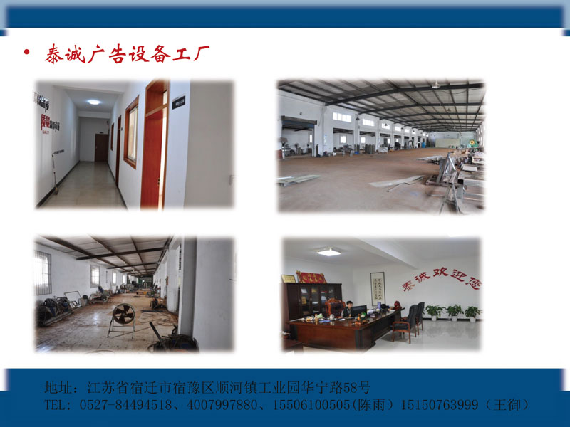 江蘇泰誠科技設(shè)備有限公司是以候車亭、景觀燈箱、閱報(bào)欄、智能垃圾箱、標(biāo)識標(biāo)牌、指路牌、垃圾分類亭等設(shè)計(jì)、生產(chǎn)、銷售為一體的現(xiàn)代化廣告設(shè)備公司位于宿遷市宿豫順河工業(yè)園區(qū),交通十分便捷。